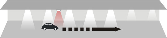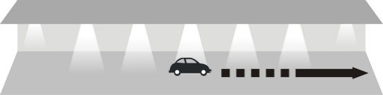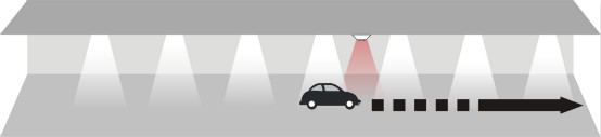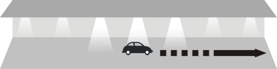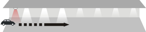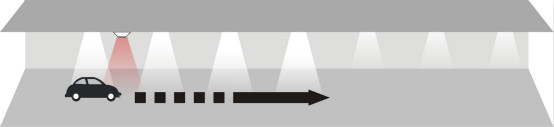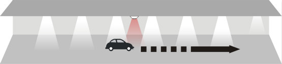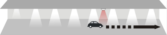 当汽车驶进停车场经过第一个PIR(热释电红外传感器),传感器探测到有汽车进入,立即亮起车头前方的3盏灯,灯的亮度客户可以自行设置,设置范围:50%~100%;